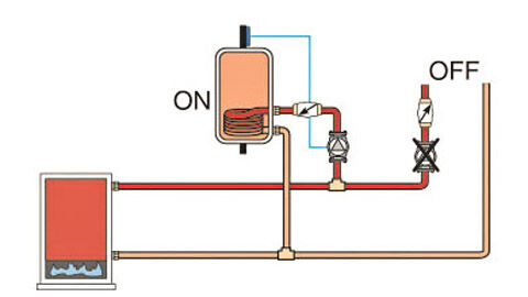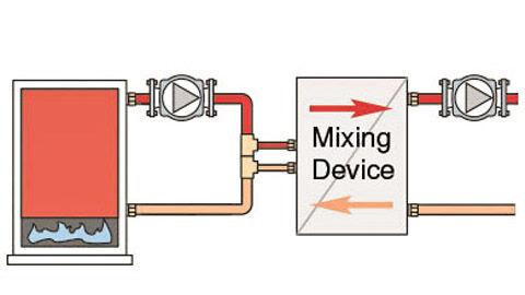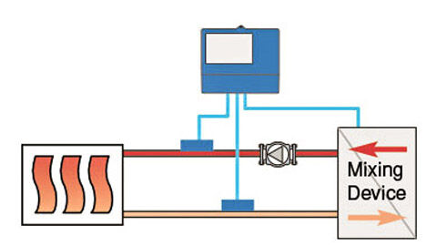 To protect the boiler against flue gas condensation and thermal shock, a mixing device should be used to control the load on the boiler. If the temperature of the boiler is below the condensation temperature or the return water temperature suddenly cools down, the mixing device can back off, allowing the boiler loop to come up to temperature. By protecting the boiler, this function provides longer boiler life.