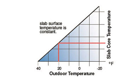 In snow melting systems the slab sensor is normally an inch below the slab surface. When the outdoor temperature suddenly drops, the sensor does not register this change immediately and surface freeze up could occur. The heat input to the slab must therefore increase as the outdoor temperature drops in order to provide a constant slab surface temperature.