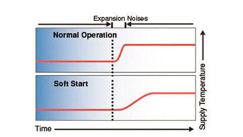 When a sudden change of supply water temperature occurs, the heating system is subjected to thermal stresses. This is evident in expansion and contraction noises. A change in supply water temperature results from a change in outdoor temperature or a change from a setback period to a recovery period. A soft start allows the control to slowly ramp up the supply water temperature to minimize expansion noises and thermal stresses.