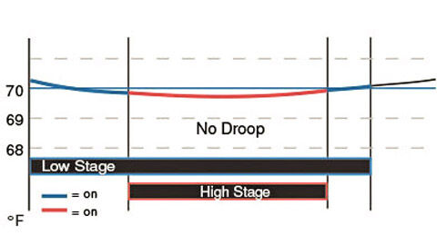 To provide proper two staging heating and an accurate room temperature, PID (Proportional, Integral, Derivative) control logic should be used. With PID control logic, the operation of the second stage depends on how far the room temperature is below the set-point, how long the error has persisted, and how fast it is changing. This function prevents room temperature droop that is commonly seen with conventional two stage thermostats.