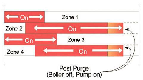 Since a zone control calculates all the on times of the zones, a zone post purge can be performed. Before the last zone is turned off in a heating cycle, the boiler is turned off but the zone continues to draw heat from the boiler. This post purge decreases boiler standby losses and reduces overall energy consumption.