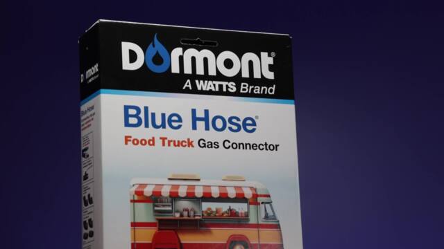 The Dormont® Blue Hose® Food Truck grade gas connector is designed for use with cooking equipment in mobile food preparation vehicles. Fulfills Requirement in IFC 2018 and IFC 2021 for Food Truck Gas Appliance Connections. The gas connector is composed of a 304 stainless steel corrugated tube covered with a tight weave stainless steel braid. The outside hose coating is an antimicrobial PVC coating that inhibits growth of bacteria, mold and mildew, and features built in UV protection. Rotational technology fittings on both ends of the connector rotate 360 degrees, greatly reducing stress at both connector ends. Box contains connector, full port shutoff valve and 2 elbows.