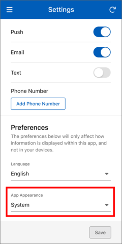 The app offers three appearance options: Light, Dark, and System. When System is selected, the app will automatically match your mobile device's appearance settings.