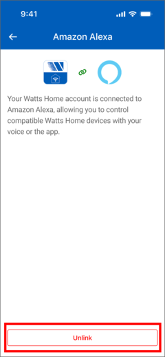 - On the Amazon Alexa screen in the Watts Home app, tap Unlink