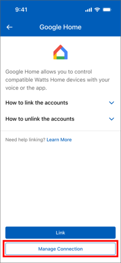 Within the app, you are able to manage Watts Home connections to Google Home.